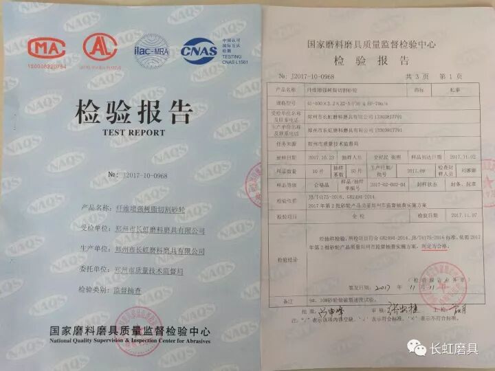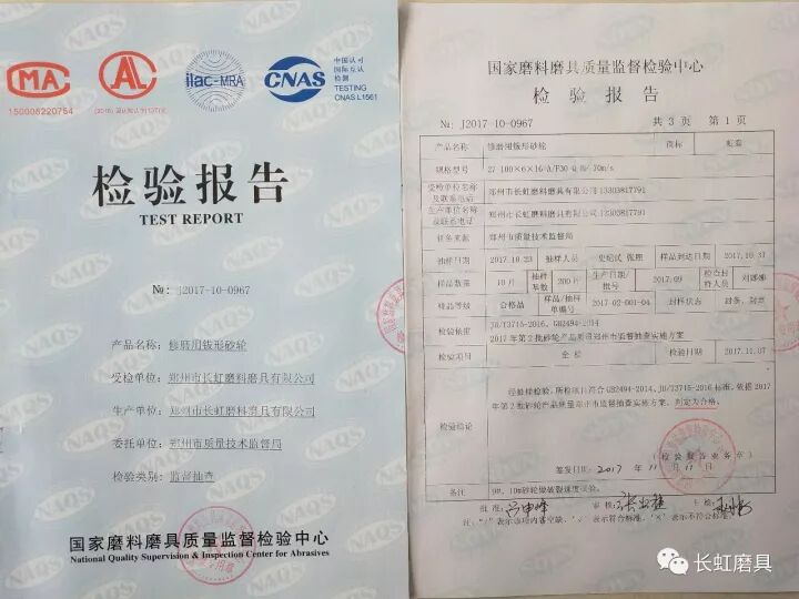 鄭州市長虹磨料磨具有限公司在生產過程中遵照國家標準和樹脂砂輪的行業(yè)標準;嚴格按照ISO9001:2015質量管理體系的要求執(zhí)行,確保產品品質滿足標準要求,質量穩(wěn)定。 2017年10月份、11月份國家磨料磨具質量監(jiān)督檢驗中心受河南省質量技術監(jiān)督局、鄭州市質量技術監(jiān)督局委托,分別對我公司產品進行抽樣檢測,檢測項目包括回轉強度、靜平衡、孔徑等。我公司產品一次性合格通過檢測。