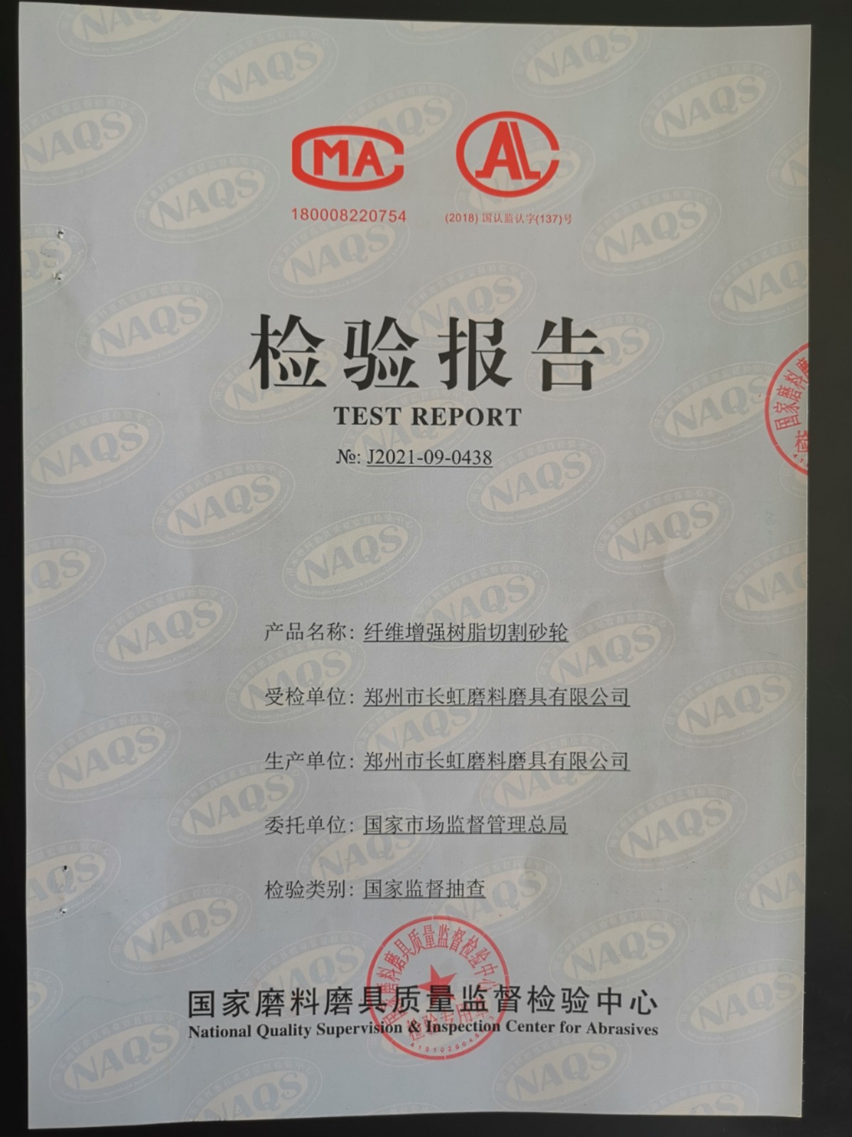 當前位置:主頁 > 新聞中心 公司產(chǎn)品在國家市場監(jiān)督管理局抽檢中檢驗合格發(fā)布時間:2021/10/5 發(fā)布人:長虹磨料 瀏覽:4074次 2021年8月,國家市場監(jiān)督管理總局委托國家磨料磨具質(zhì)量監(jiān)督檢驗中心對我公司砂輪產(chǎn)品抽檢,抽檢工作人員在我公司倉庫采用隨機抽檢的方式,抽中金虹泰400*3.2*32綠色產(chǎn)品,依據(jù)《砂輪產(chǎn)品質(zhì)量國家監(jiān)督抽查實施細則》及GB2494-2014,JB/T4175-2016標準,所抽檢樣品判定為未發(fā)現(xiàn)不合格。